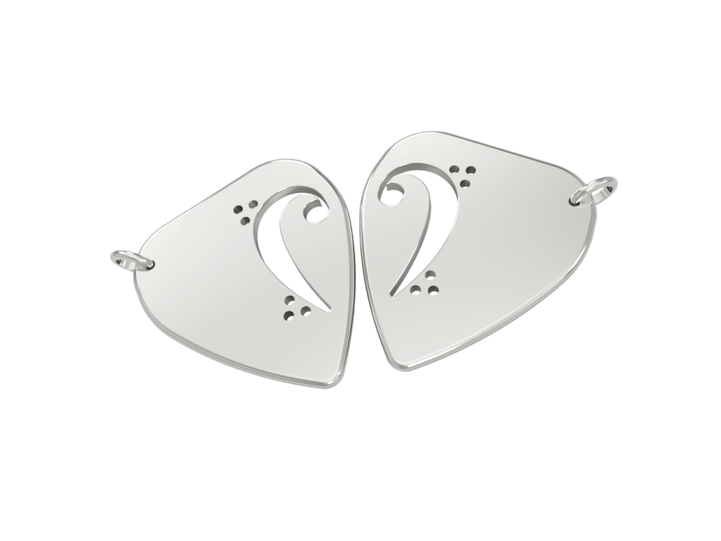Due gemelle omozigote, indistinguibili esteticamente ma caratterialmente uniche e distinte. Due ciondoli apparentemente identici ma che affiancati uno all’altro esprimono le due personalità e il legame tra queste due persone. Questi sono i ciondoli Basso di Rana, per due musiciste, chitarra e basso, che avvicinano il plettro alla chiave di basso; la passione comune per gli anfibi, le raganelle e ovviamente l’affetto indescrivibile del legame tra sorelle gemelle.